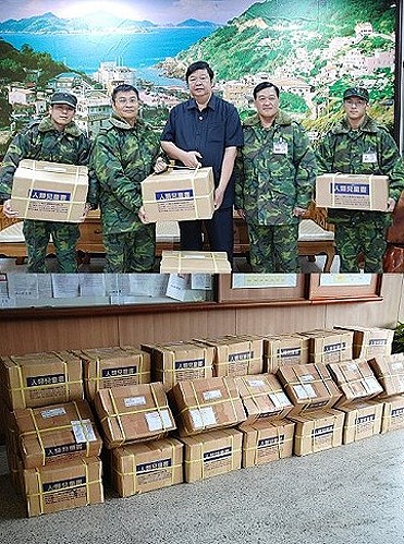 馬防部指揮官羅際琴(左二)代表民間友人捐贈八套市價共超過三十萬的兒童優良系列叢書給全縣各小學,昨天縣長陳雪生代表接受,這位善心企業家雖然不願具名,但陳雪生仍代表馬祖鄉親表達誠摯謝意。(圖/文:劉秋月)