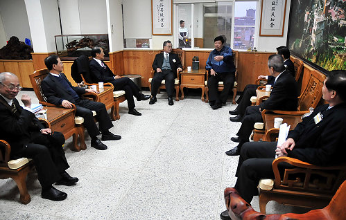 傍晚前往縣府拜會,受到縣長陳雪生的熱情歡迎;許勝雄特別表示,該會每年都會安排會員赴離島勞軍,以展現他們的愛國敬軍情懷,對馬祖軍民長年戍守前線、努力保衛台海安全的辛勞表示感佩,也感謝地方政府的協助,讓此行順利推展;而經過一天的參訪,他也盛讚馬祖有優美的自然景觀及青山綠水,可以感受到地方政府在發展觀光上的努力;陳雪生則表示,要加強與北市各民間團體的互動,吸引工商業界成員來馬度假,他也與許勝雄暢談兩岸交流趣事,雙方閒話家常、相當愉快。