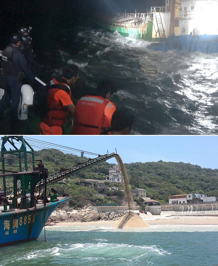 【記者曹重偉報導】馬祖海巡隊7月16日晚間19時許實施海上巡邏勤務時,於南竿津沙海域查扣非法越界抽砂船「海○8XX8號」,依臺灣地區與大陸地區人民關係條例將「海」船及8名船員帶回南竿隊部扣留查處,為避免產生防疫破口,執勤人員全程均落實各項防疫措施。另於17日11時押解「海」船至津沙海域實施卸砂回填,計回填約二千餘噸,以維護馬祖海域國土資源。