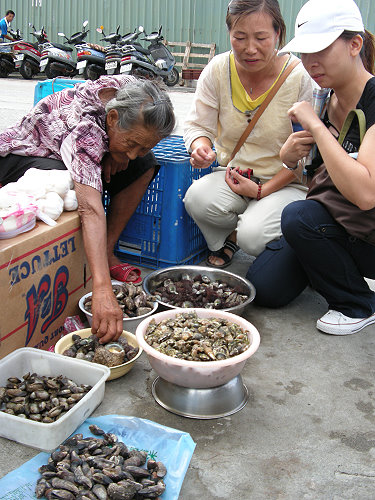 山隴市場外攤販出現叫賣的野生蚵及螺,吸引台灣遊客好奇目光。(圖/文:劉秋月)