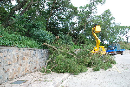 仁愛村馬祖野戰醫院前路旁大樹其中一棵,不曉得何故越長越彎,樹枝橫跨三分之二的馬路,原來鄉親都不以為意,但這次鳳凰颱風來襲,大樹似乎彎得更厲害了。仁愛村村長向南竿鄉公所及建設局反映,暑期颱風多,為免下一個颱風來臨,樹倒可能會壓到路人,因此建設局立即派員,進行砍樹的工作。雖然砍樹諸多不捨,但為免大樹傾倒造成危險,仍然必須處理。