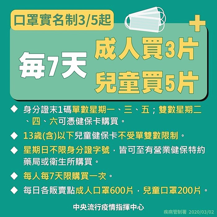 指揮中心指出,中央今天起將全國各據點(含健保特約藥局及衛生所)成人口罩的每日提供量,由400片增加為600片,兒童口罩則因絕大部分據點均有剩餘,維持每日提供量為200片,仍限13歲以下兒童健保卡購買,其餘成人口罩和兒童口罩的購買原則和價格亦不改變。調整之後,全國實名制口罩總供應量將由原本每日約390萬片提高至每日約520萬片,其餘產能提供醫療、防疫、產業等需求。
