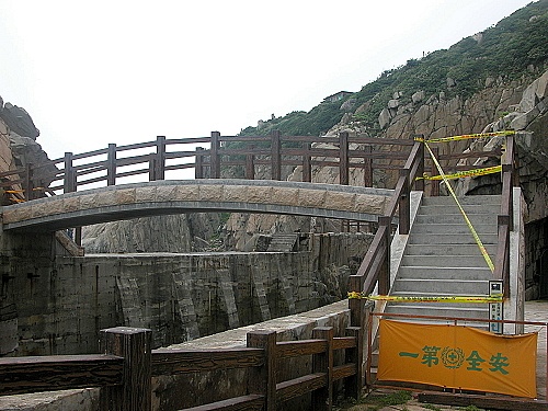 東引北海坑道防波堤上的欄杆進行修建,遊客請不要登上天橋。(圖/文:陳其敏)
