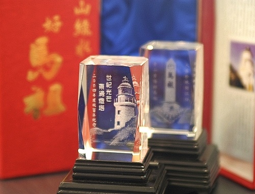 「世紀光芒東湧燈塔」雷射雕刻,不含底座,長寬約五公分、高約七點五公分,以紅色錦盒收納,用先進的雷射雕刻技術,刻以東湧燈塔圖案以及「世紀光芒東湧燈塔二○○四年建成百年紀念」等字,底座有藍、紅、黃三色燈,除了展現東湧燈塔不同風華,還可以當作浪漫溫馨的小夜燈使用,另外業者還推出馬祖劍碑造型的雕飾。
