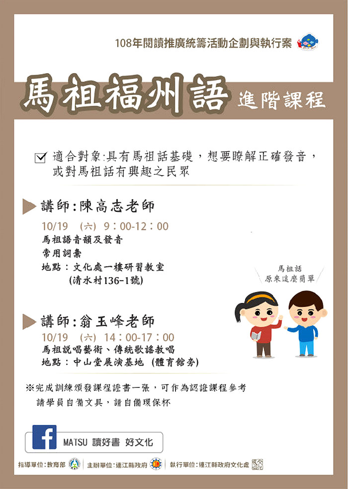 馬祖語教學:上午9時至12時,由陳高志老師指導馬祖語音韻及發音、常用詞彙,地點在文化處一樓研習教室。