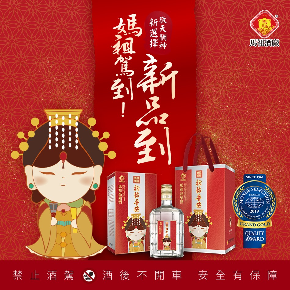 馬祖因媽祖而得名,每年農曆9月9日為媽祖在馬祖昇天祭,每年吸引信眾跟隨媽祖腳步一同繞境祈佑平安。馬祖酒廠總經理劉九銘表示,馬酒公司為積極參與地方宗教民俗一大盛事,特別推出高粱酒新品新包裝-媽祖賜福祈佑平安酒,為致贈長輩及貴賓最佳之地方特色伴手禮,也適合廟會慶典之最佳供品。再加上祈佑平安酒包裝質感精美,讓民眾在品飲時,能感受到濃烈的酒香與祝福。