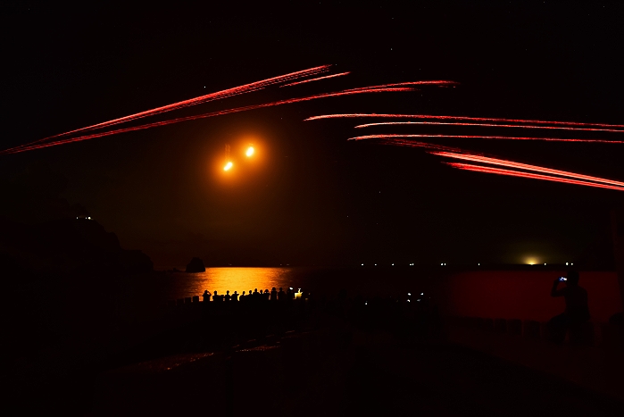 昨天晚間7時30分,東引駐軍於北澳空域實施實彈射擊,選手、遊客齊聚中柱橋、感恩亭屏息等待。射擊命令下達,曳光彈照亮夜空,接著槍聲大作,迅雷子彈在黑夜中化作萬點火光,交織成綿密火網震撼場景,讓遠來的選手與遊客充分體驗到前線戰地的特殊氛圍。