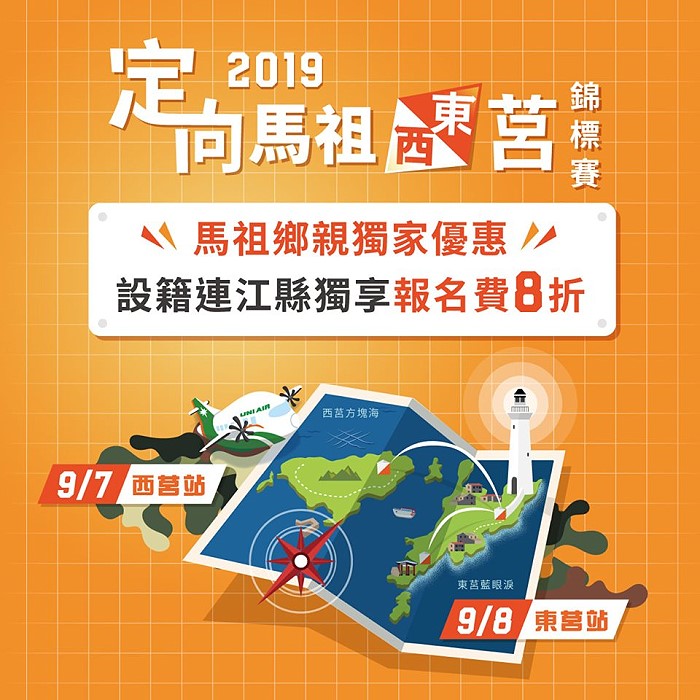 【記者吳嘉榮報導】2019年馬祖定向東西莒錦標賽9月7日、8日登場,馬祖首辦定向越野賽事,挑戰選手智力與體力,探索莒光鄉雙島美景美食,機不可失,報名即日起至6月30日,報名網址(https://bit.ly/2WjoqGS),還有在地鄉親優惠方案,千萬不要錯過。