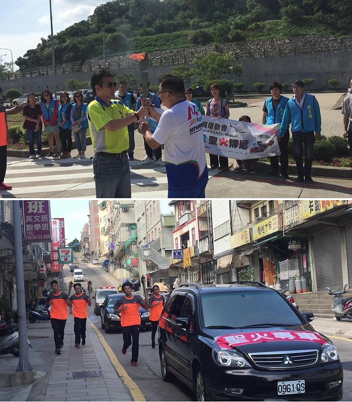全民運動會聖火昨日由曾慶寧校長等9人組成聖火小組抵達馬祖,縣府教育處長陳冠人代表接下聖火,再將聖火轉交地區角力隊展開聖火傳遞行程。在聖火專車引導及警車護送下,抵達終點南竿體育館,完成聖火傳遞任務。