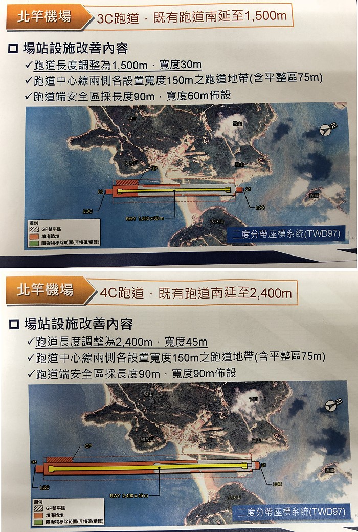 民航局委託專業單位初步完成北竿3C及4C機場跑道配置,兩方案均是向南面填海延伸。(圖:民航局)