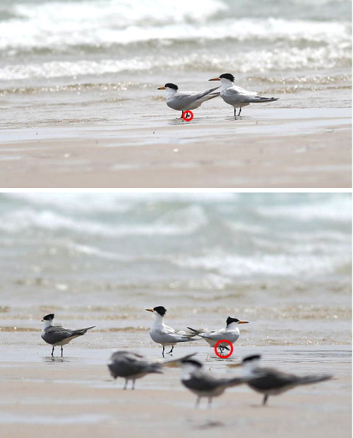 繫放編號「A74」足旗(上圖紅圈、左)的黑嘴端鳳頭燕鷗26日下午在西莒坤坵沙灘拍到,連續3年都回到馬祖,右為伴侶。(圖:王建華提供)
