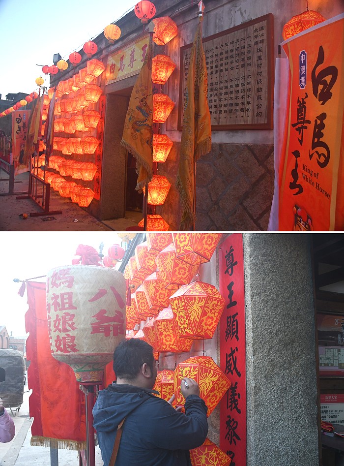 風燈是馬祖節慶傳統花燈,有添丁添福寓意。白馬尊王廟今年比照去年在坂里大宅前方製作一面風燈燈牆,上午開始開放讓民眾在燈上寫下心願,許多遊客陸續前來體驗,就連在地鄉親也少有機會在風燈上寫字,就像平溪天燈一樣,把心願寫在燈上,祈求願望實現,晚間點亮整片燈牆,光彩奪目,也看見滿滿祝福。