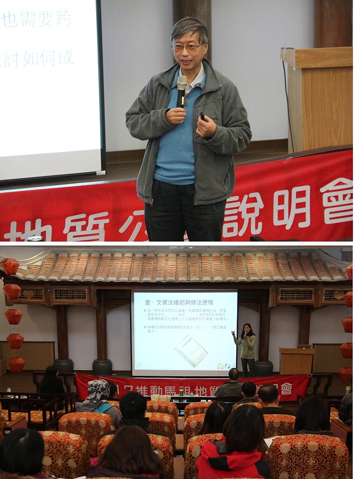 馬祖地質公園權益關係人說明會21日召開,邀請台大地理環境資源學系教授林俊全、林務局保育組長夏榮生等人說明地質公園法源與辦法等議程。(圖/文:吳嘉榮)