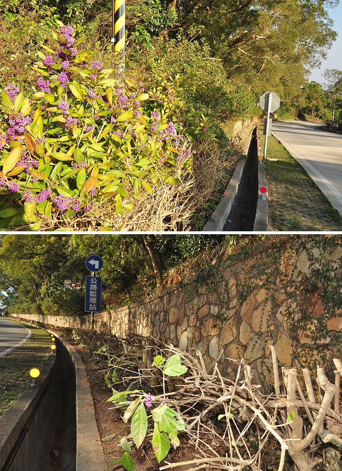 產發處則回應,紫珠生長快速,該路段紫珠高度過高,且地處遮陰處,紫珠結果狀況不好,植栽過高也擋住後方杜鵑觀賞視線,等到春天杜鵑花開時,兩種植物交錯看起來會顯得雜亂,因此都會定期修剪,控制植栽高度,修剪也需配合植栽生長期,因此才會在這時候修剪,其他地區紫珠就沒有這個問題。