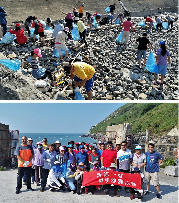東引鄉公所昨天下午2時30分在北澳口辦理「就愛『北』疆,笑『澳』江湖」淨灘活動,鄉長楊雲成、鄉代主席陳子驎也到場與鄉親一起動手淨灘。經過2小時的清理,散落在海邊礫灘上的寶特瓶、保麗龍、漂流木等廢棄物,全部清理乾淨。