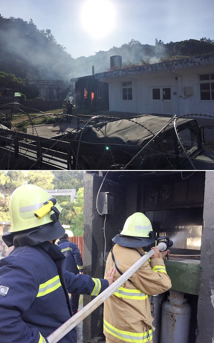 南竿珠螺村軍方基地28日傍晚疑似因為廚房瓦斯鋼瓶管線老舊,導致瓦斯外洩起火;經連江縣消防局緊急出動救火車會同義消人員快速撲滅火勢,僅一人受傷送醫,並未造成重大損失。(圖:連江縣消防局)