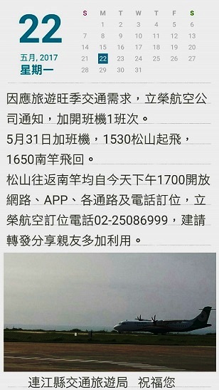 【本報訊】因應旅遊旺季及連假交通需求,立榮航空通知5月31日加開班機1班次,松山下午3時30分起飛,南竿下午4時50分飛回,松山往返南竿均自22日下午5時開放網路、APP、各通路及電話訂位。立榮航空訂位電話02-25086999,連江縣交旅局建請轉發分享親友多加利用。
