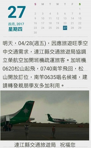 縣府協調立榮28日加班機 南竿上午6時35分唱名候補