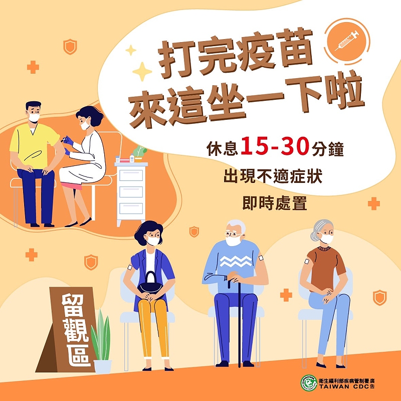 打完疫苗休息15-30分鐘。(圖:衛福部疾管署)