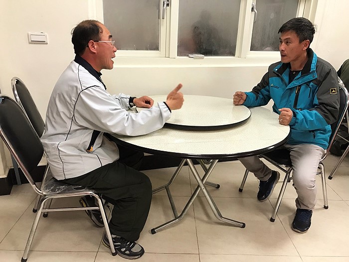 東引指揮部指揮官廖建興少將、連江航業董事長林德建,商討安排130餘位休假役男轉搭臺馬輪夜航返台事宜。(圖:連江航業)