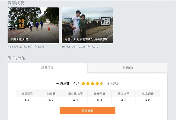 運動筆記提供選手留言評分賽事,評分有21人。該5項評分分數,目前選手給予分數補給品4.7分、紀念品/衣服4.9分、賽道/風景5.0分、報名流程4.7分、成績/證書4.8分、參賽費用4.4分(各滿分是5分),平均分數 4.7分。